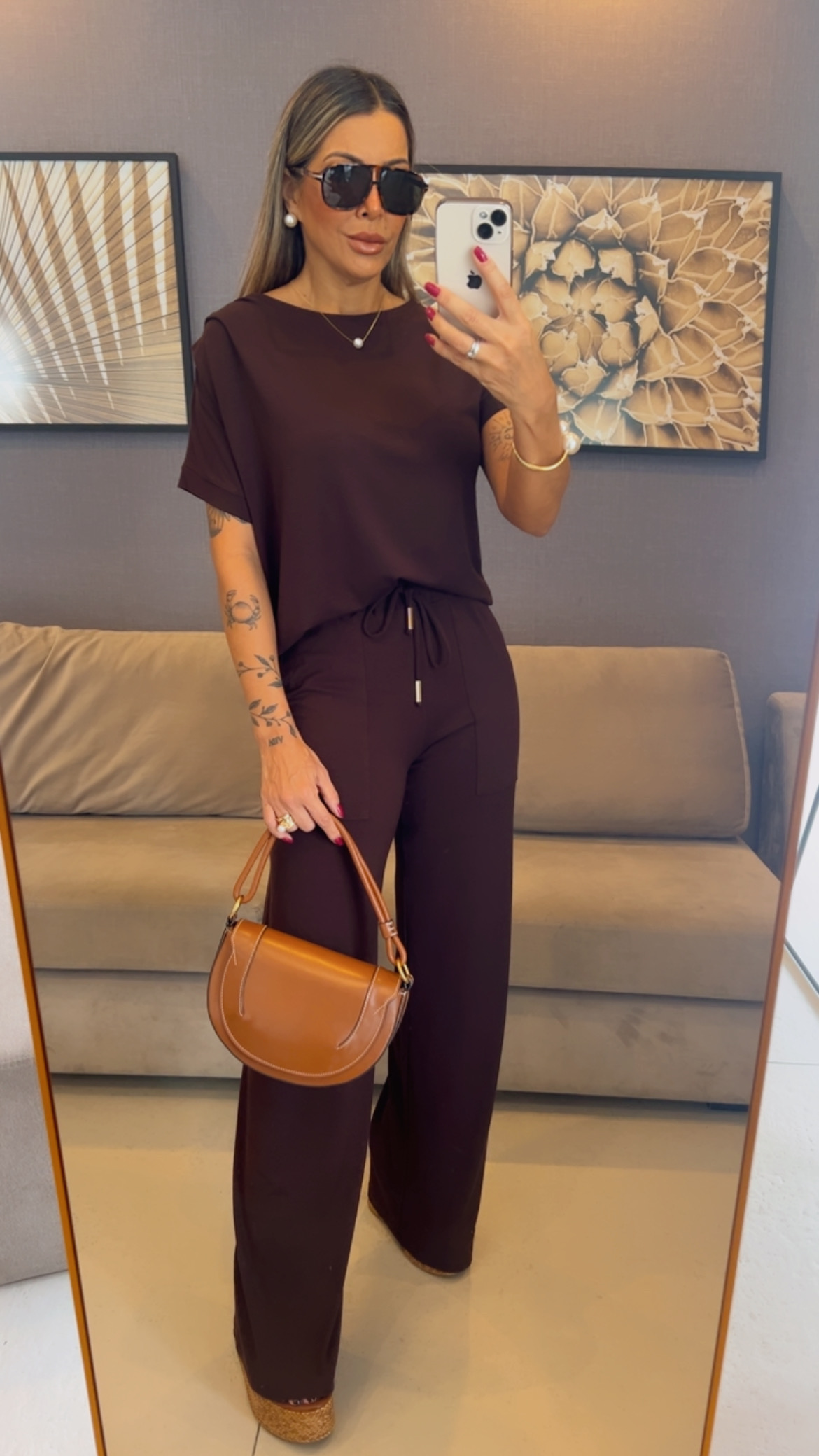 Conjunto blusa com detalhe em prega no ombro e calça, todo na viscolycra premium com elastano.